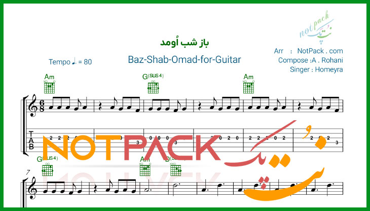 مشخصات نت گیتار باز شب اومد از حمیرا