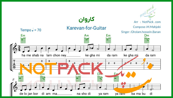 مشخصات نت گیتار کاروان بنان/همه شب نالم چون نی